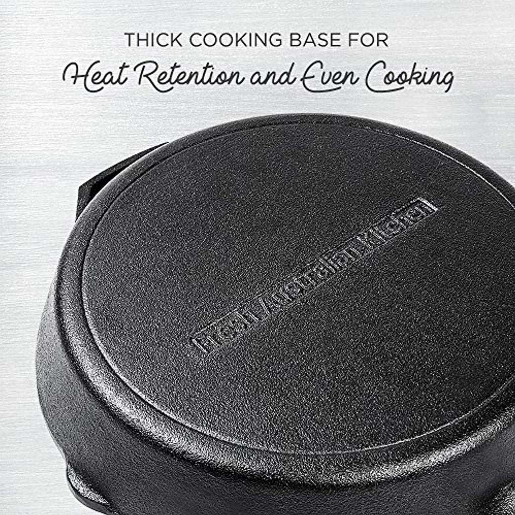 PREMIUM PROFESSIONAL QUALITY; The cast iron in the Fresh Australian Kitchen skillet has unbeatable heat retention, meaning the heat is dispersed evenly across the entire surface of its thick base to ensure thorough and even cooking with no cool spots.
