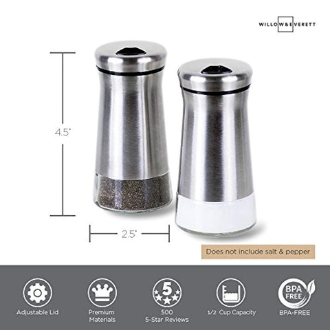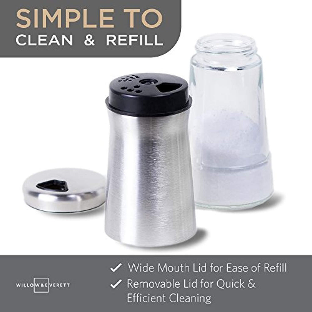 EASY REFILLING WITH NO MESSES Don't you hate constantly having to refill your salt and pepper shakers? Standing about 4.5 inches tall and holding 1/2 cup of spices, this set is the perfect size to cut down on constant refills without being bulky. When you do have to refill, the clear glass bodies will let you know when it's time! The stainless steel top easily screws off revealing a wide opening for easy and mess free refills.