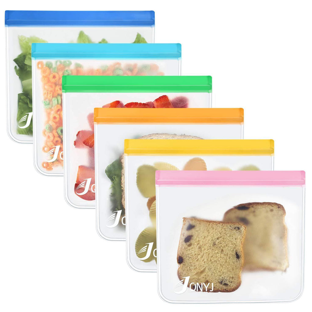 Reusable Sandwich Bags 6-Pack, JONYJ Leakproof Reusable Lunch Storage Bags, FDA Grade PEVA Kids Snack Bags, Extra Thick Ziplock Bags for Food Snacks, Make-up, Stationery, Travel Home Organization