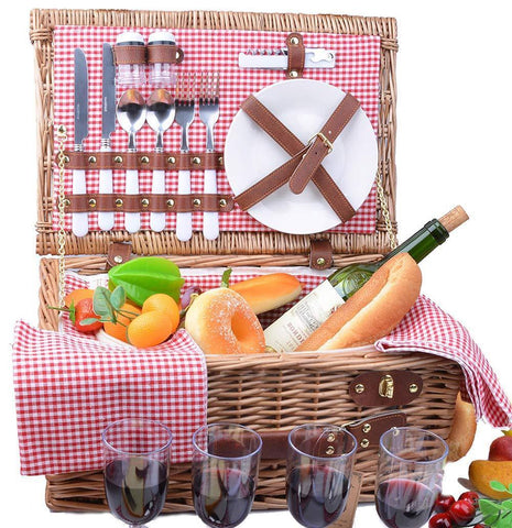 Picnic basket set for 2 including: 1 picnic basket, 1 integrated bottle opener, 2 plates, 2 glasses, 2 knives, 2 forks, 2 spoons, 2 napkins, 2 salt & pepper shakers
