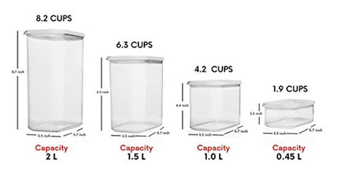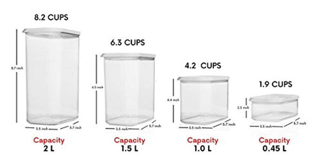COMPLETE RANGE OF SIZES - Every air-tight container has been designed to seal in freshness while making access and food prep a breeze. Full range of sizes ! store your favorite food safely into these efficient containers. With 8 different sizes for edibles of all shapes, sizes, and volumes, you won't have to worry about jamming your edibles into containers. Includes 2 Tall Container (8.4 cups /2.0 liters), 2 Medium Container (6.3 cups / 1.5 liters), 2 Small Containers (4.2 cups / 1.0 liter), 2