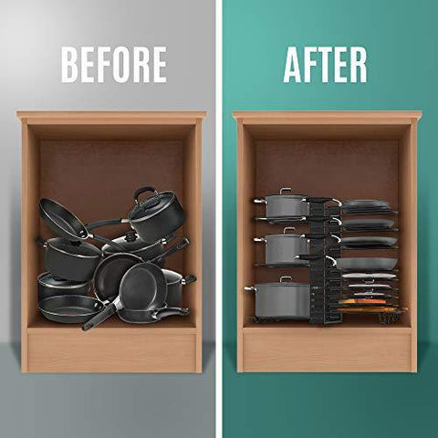★ AMPLE STORAGE SPACE – With 8 anti-slip racks that can be placed split on both sides or all on one side of our cabinet organizers, you’ll have plenty of space to store all your pans & lids. Add our 4 extra shelves to your cart for even more storage!