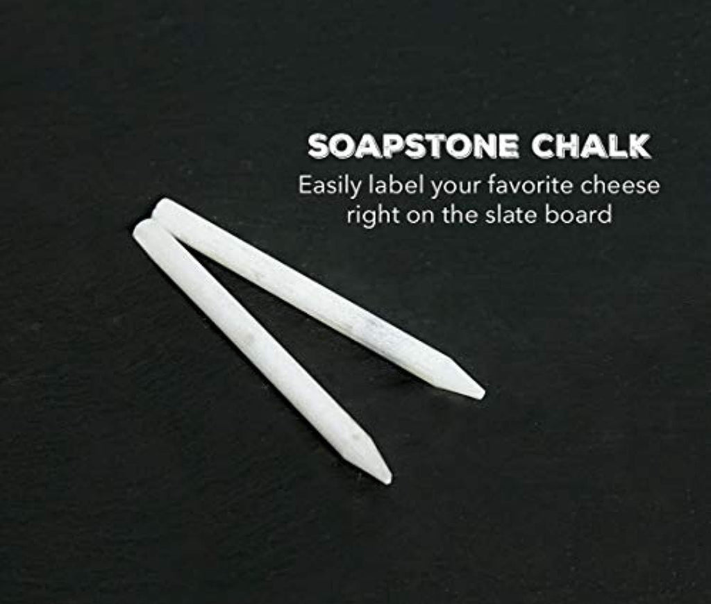 • INCLUDES 7 PIECES - Enjoy 1 premium slate board with stainless steel handles, 4 cheese knives, and 2 pieces soap stone chalk