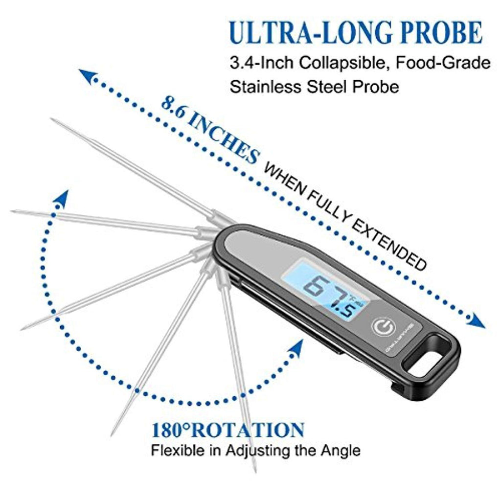 【LONG & THIN FOLDABLE PROBE】The 3.4’’ probe, made of food-grade 304 stainless steel, is splash-proof, high-temp resistant which makes it a professional restaurant chef gadget tool. Will help quickly and safely get the internal temperature of any cooked food. With wide measuring range - 20~250°C (-4°F ~482°F), this turkey thermometer can be used to test the temperature of meat, pork, beef, chicken, turkey, fish, casseroles, ham, lamb, candy, coffee, tea, or baby milk etc.