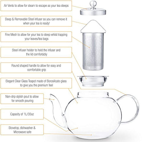 • [ 3 IN 1 STOVE TOP, MICROWAVE & DISHWASHER SAFE ] These features make this premium and high quality borosilicate glass teapot practical for use in any setting. Why not put it on any gas or electric stovetop and use it as a kettle? You can heat or reheat your tea in the microwave as a quicker alternative. All components of the glass teapot can be washed in the dishwasher, making tea hosting a breeze. Make your tea however your heart desires and bring out your inner tea enthusiast.