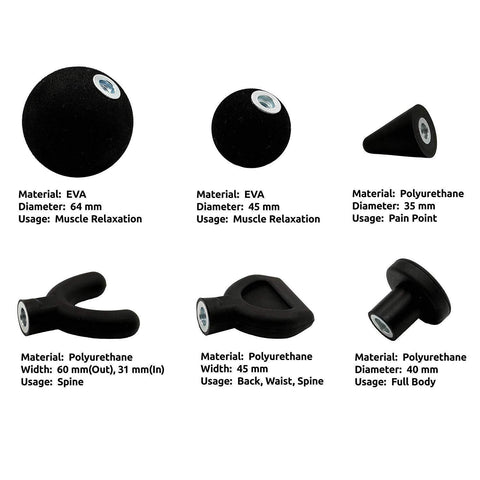 -INCLUDE: 6 pcs massage heads (include 2*spherical head, 1*gimlet point head, 1*T-shape head, 1*U-shape head and 1*shovel shape head) + 4 pcs connecting shanks(include 2*Standard shank, 1*non-standard short shank, 1*Extension shank).