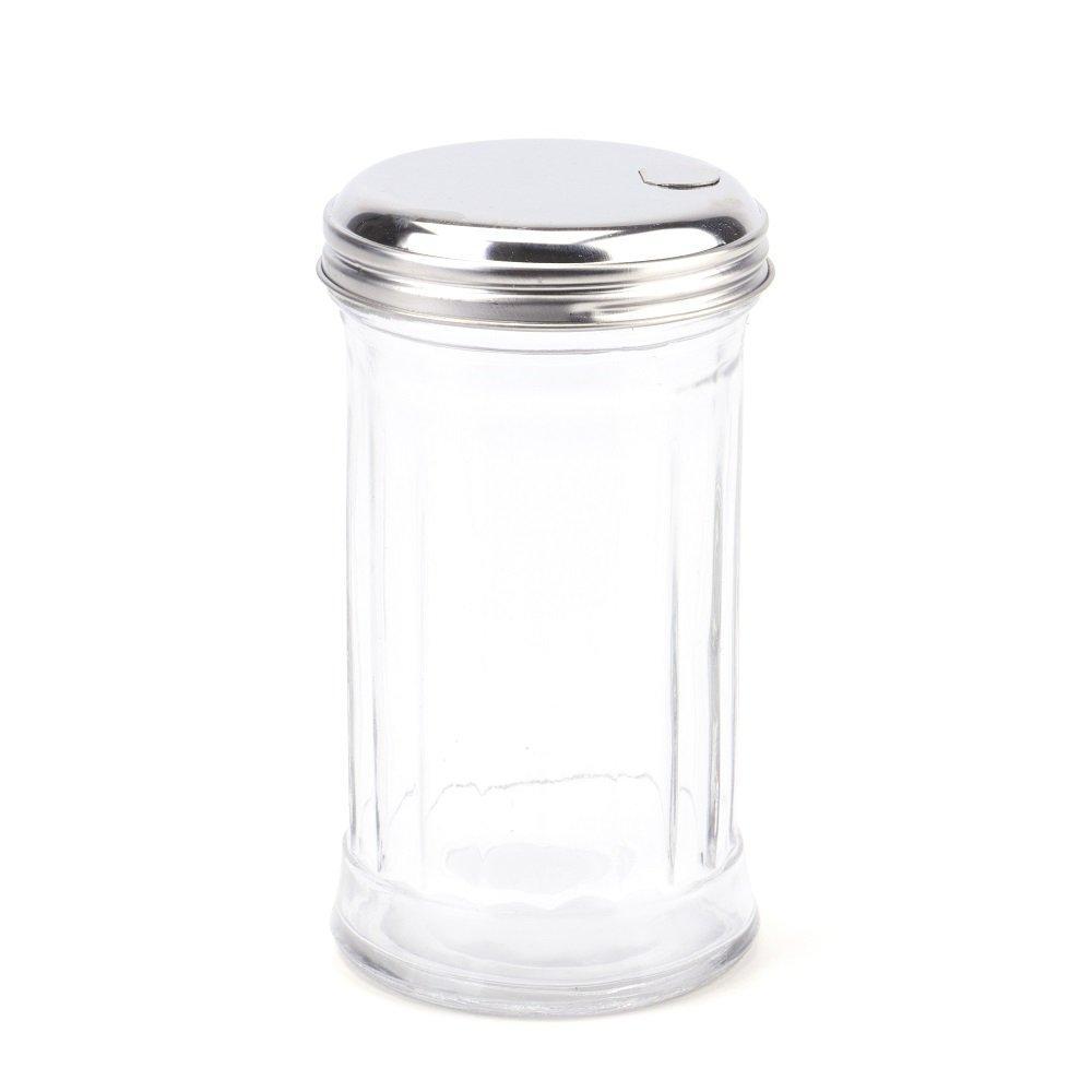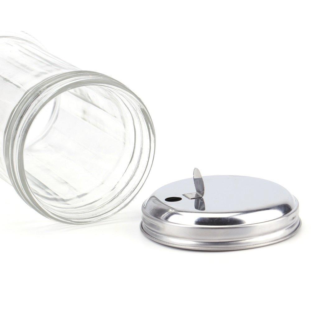 Thick construction glass jar.Stainless steel screw-on/off lid and pour-flap spout Classic retro style sugar dispenser.