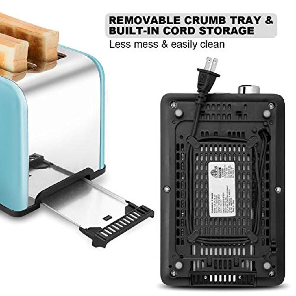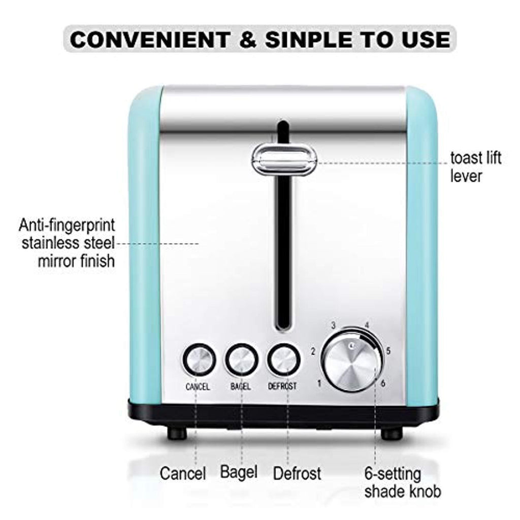 • 【RETRO STYLE MAKE UNIQUE】- Retro and compact stainless steel 2 slice toaster with Turquoise blue color is not just a delight to the eye, but can fit your kitchen perfectly, less counter space needed. Beautiful, Unique and Practical.