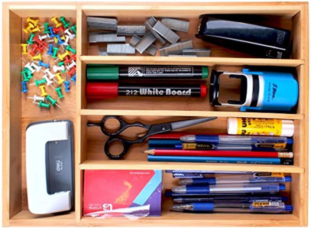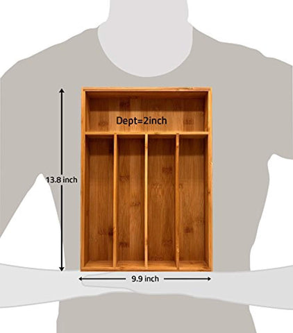 Tray features 5 dividers that help in organizing different cutlery pieces; bamboo tray can be used in the kitchen for organizing different kitchen gadgets, in the bathroom as a cosmetics divider, and in the utility room as a hardware organizer