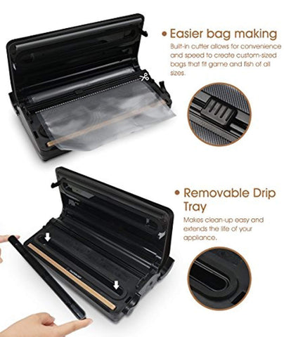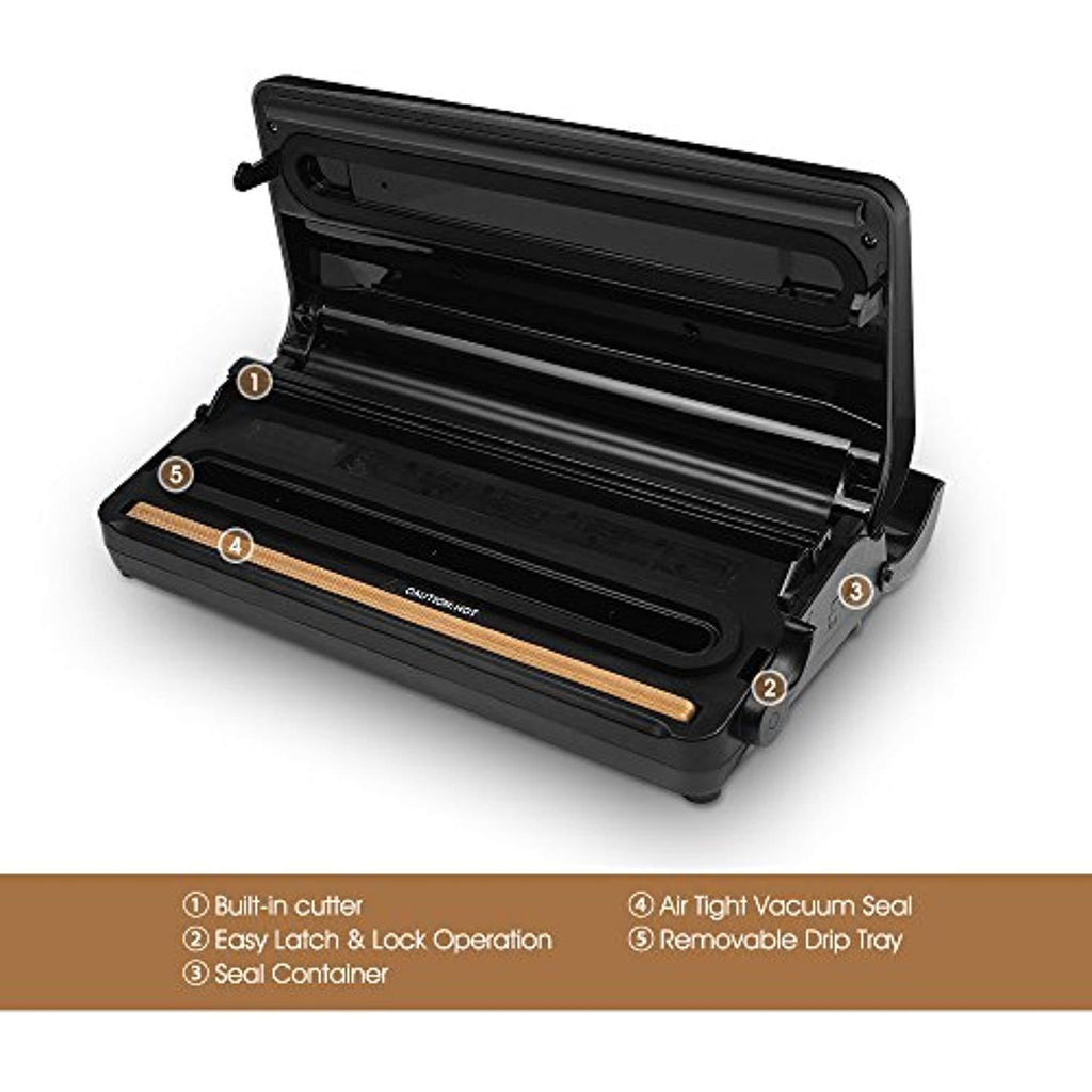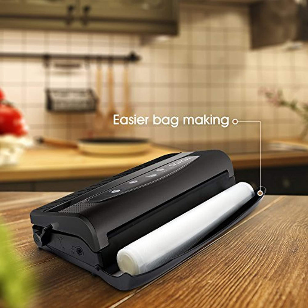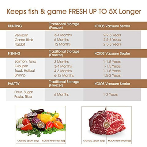 Powerful Vacuum Sealer : Speedy vacuum sealing and high vacuum pressure. Dry and moist food modes are available. The adoption of a 110W energy-saving motor provides a home use lifespan of 10 years, thanks to its non-consumable design, non-mechanical brushes and low interference.