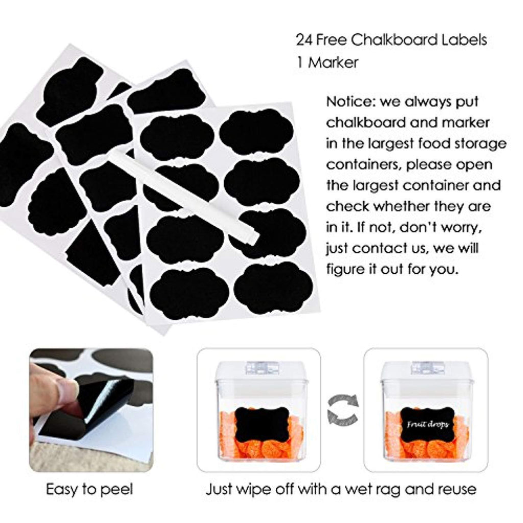 • 24 Free Chalkboard Labels and 1 Marker----Except 7 cereal storage containers, you will also receive 24 pieces labels and 1 marker, which will help you never confuse flour with powdered sugar or baking powder with baking soda. They are reusable, you can switch contents whenever you need. Just wipe clean with a damp cloth to change what you have written, Peel and Re-stick.