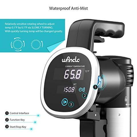 • CLEVER DESIGN, SINGLE-HAND OPERATION: Attach sous vide cooker to any water-filled pot you already have, put your ingredients in a sealed bag or glass jar into the pot, set time and temperature, then press start with one hand to start the process; Curved design prevents control panel from mist; Food grade stainless steel; Overheat and low water level protection mechanism.