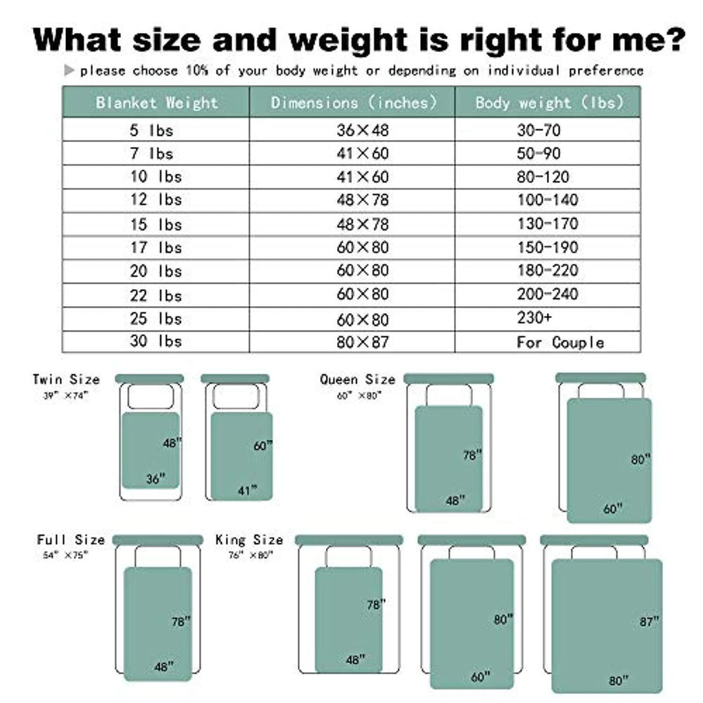 • CHOOSE & USE INSTRUCTION - Please choose 10% of your body weight + or - depending on individual preference. Due to its weight, it's not necessary to choose oversized blanket. Recommend 48''x78'' for twin bed, 60''x80'' for queen bed, 80''x87'' for king bed. It not only can be used at sleep, but also can be used while reading.