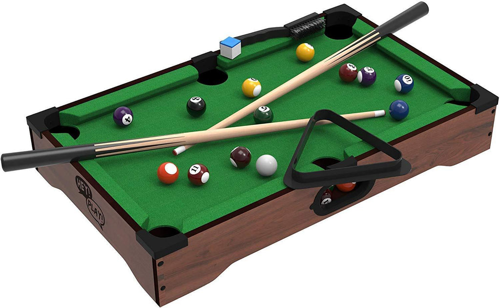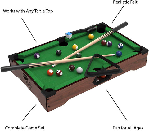 Mini Tabletop Pool Set- Billiards Game Includes Game Balls, Sticks, Chalk, Brush and Triangle-Portable and Fun for the Whole Family by Hey! Play!