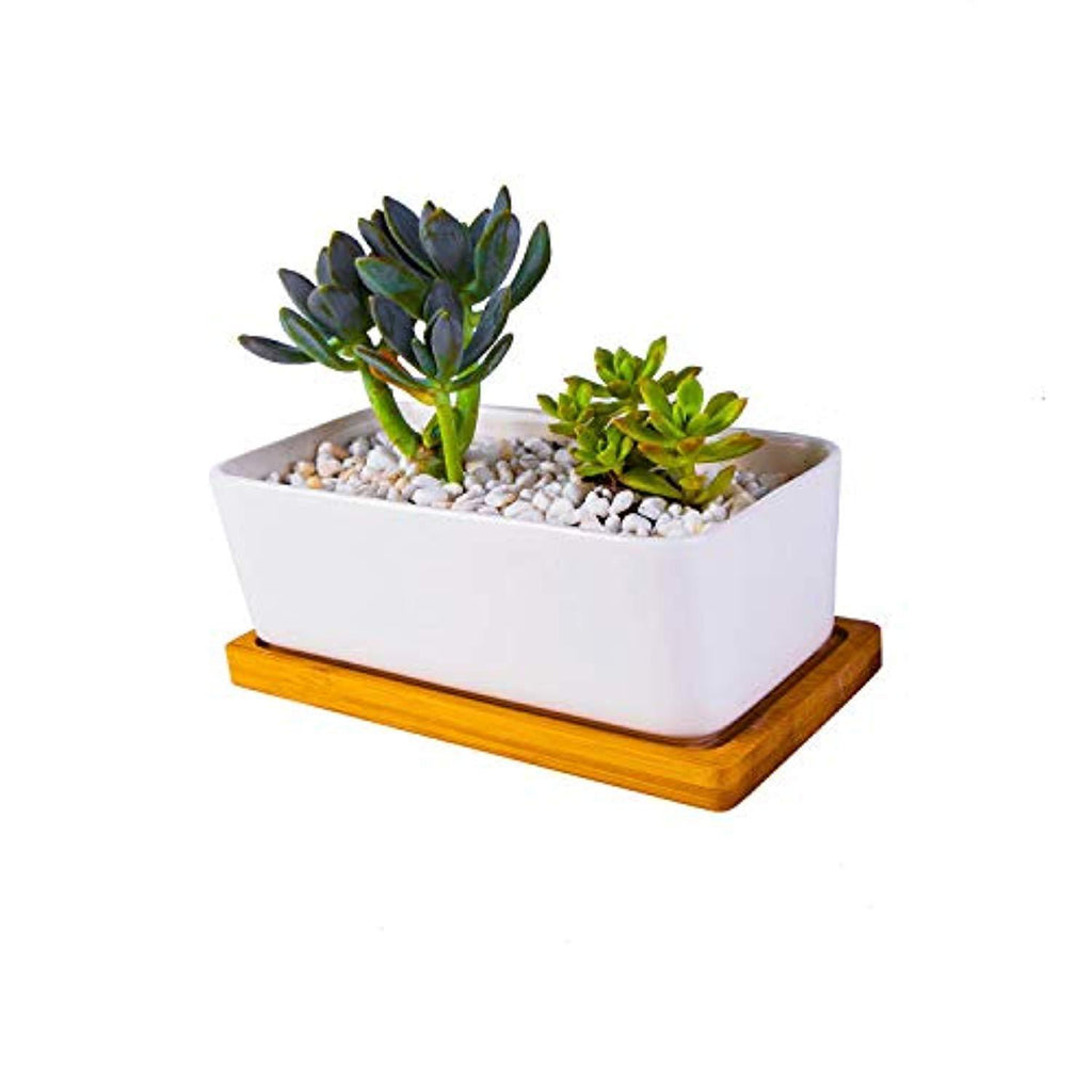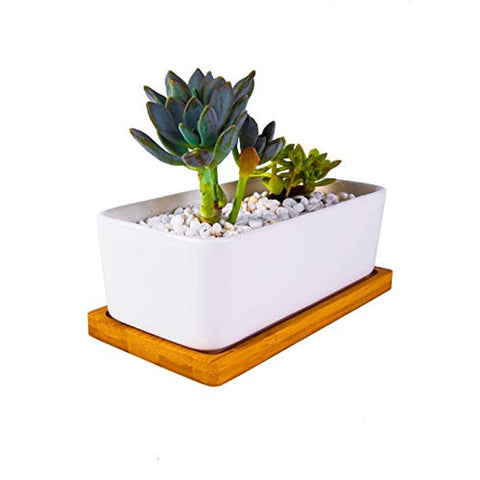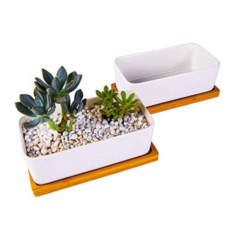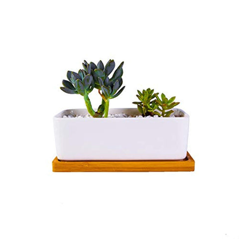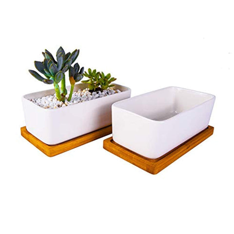 6.5 Inch Ceramic Rectangle Succulent Planter with Bamboo Saucer, Set of 2, White Modern Indoor Cactus/Flower Plant Pot with Drainage, Decoration for Desks/Bookshelves / Window Sills (A)