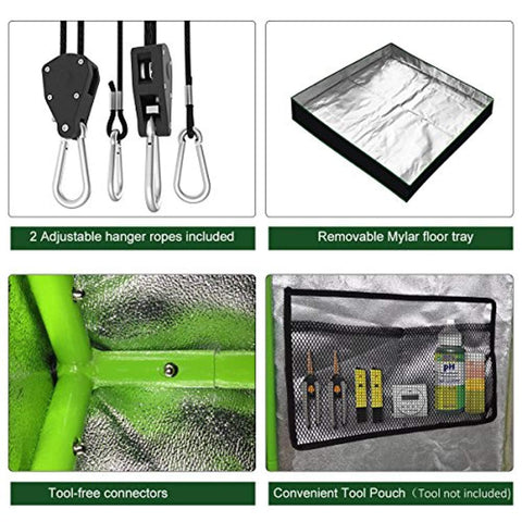 • An Upgraded Version & Warranty: 2-year warranty! Return or refund can be negotiated it if your expectations are not exceeded. NOTE: Carbon filter, grow light and aluminum duct are for demonstration purpose only, not included. Accessories Included: 1 removable floor tray, 2 adjustable rope hangers and tool bag on the internal face. PLEASE BE NOTED THAT: This is an upgraded version. Compared with the former version, 2 adjustable rope hangers, tool bag and observation window are added.