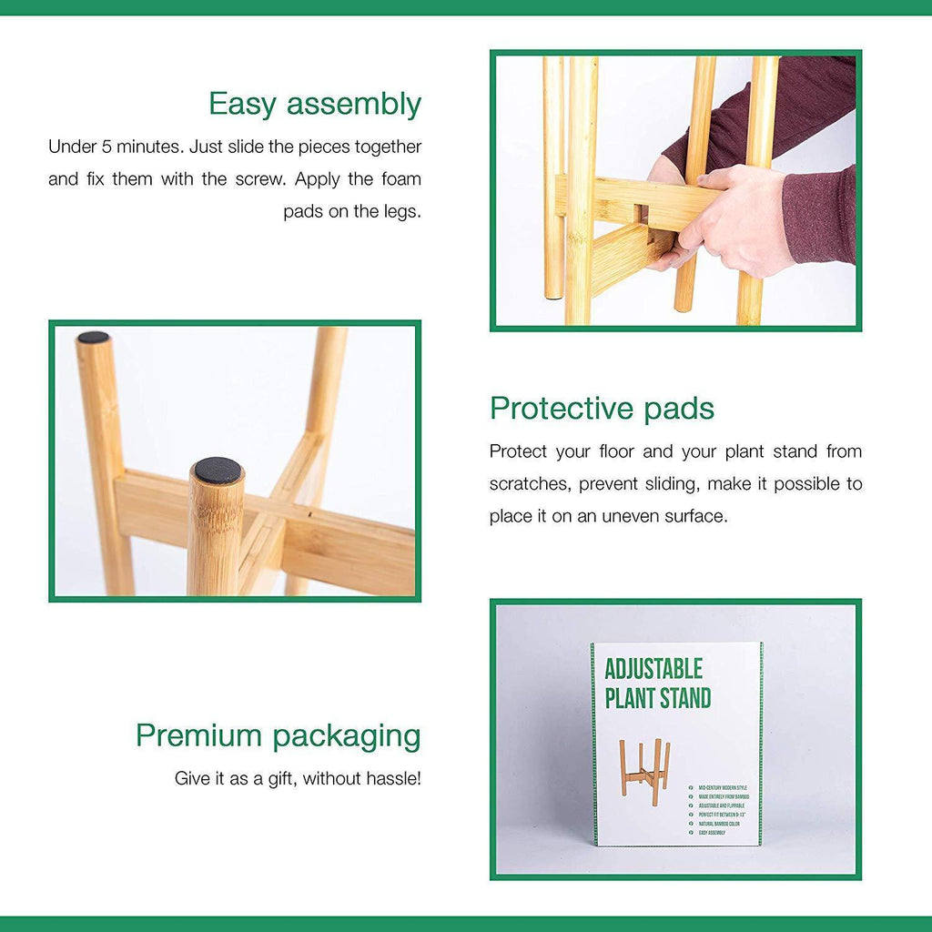 • ◈ JOY TO ASSEMBLE WITH EXTRAS... after opening your newly arrived plant stand's box, while the scent of the bamboo slowly hits you. After following the easy steps of the manual, you find yourself with a great looking new furniture in the house, assembled under 5 minutes. The Bamboo House Plant Stand comes with EVA foam pads, for protecting your furnitures and your floor. You can also find and extra set of these protective pads in case you want to change the look of it, by flipping the stand.
