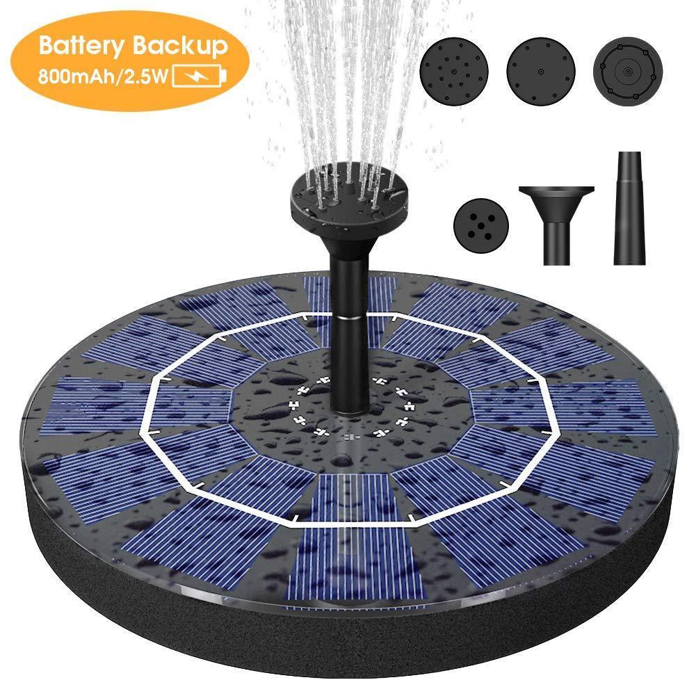 • ☀ Constant Flow Solar Fountain with Battery Backup - Our 2.5W solar panel & 800 mAh battery is more powerful than other solar fountain, and our fountain can store electricity in the battery. When the sun shines, the excess electricity will be stored in the battery, ensuring the fountain constant flow, it will continue to work without spurt intermittently! (Even the sun is weak)