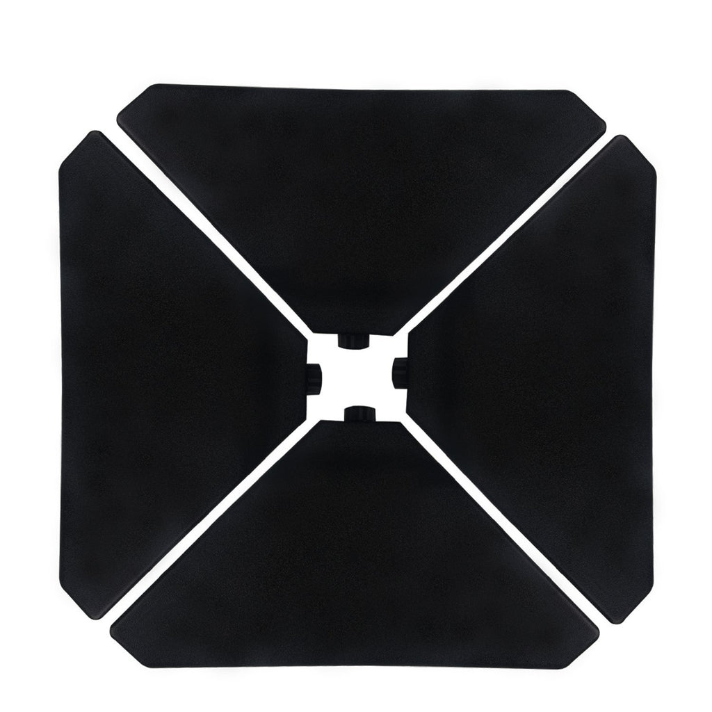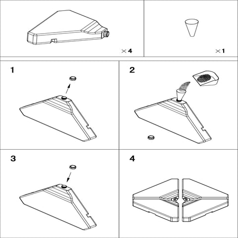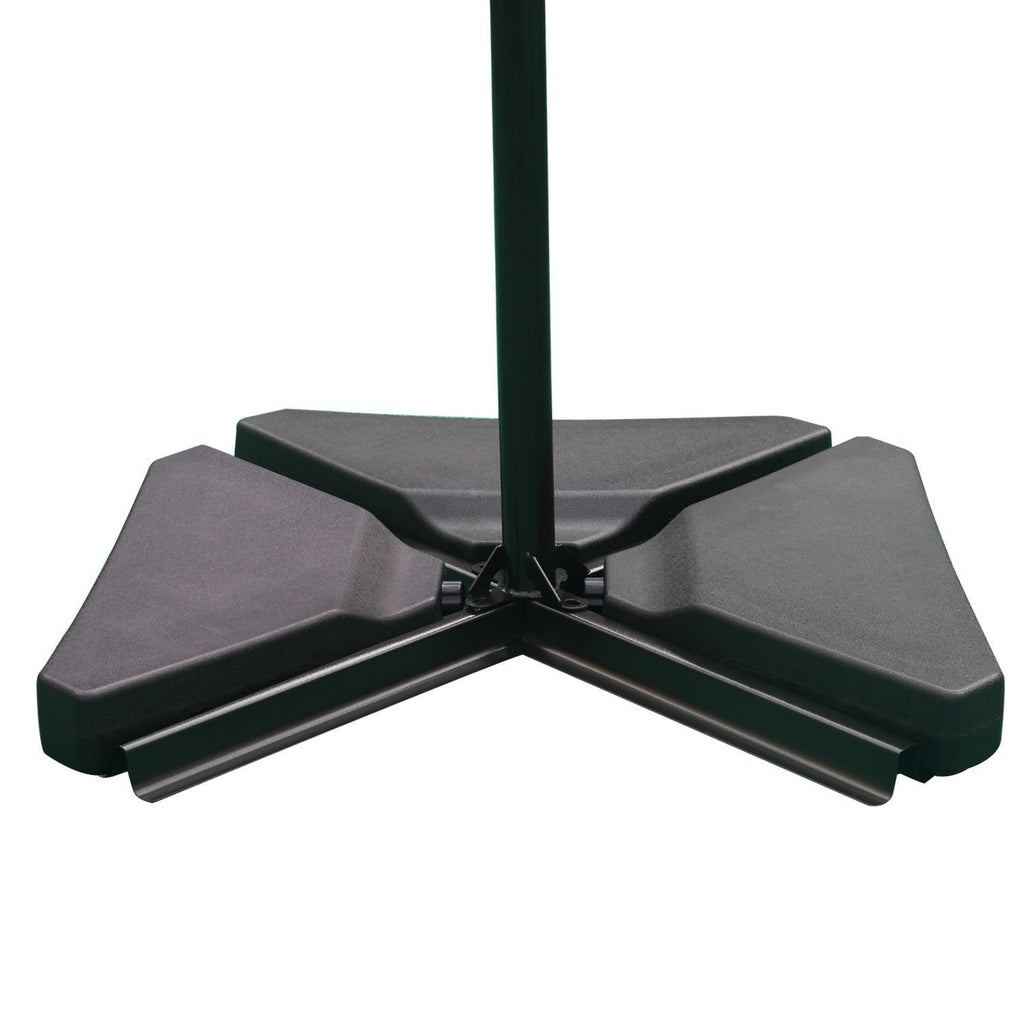 Plastic umbrella base plate set(4 triangular pieces for 1 set), in Black, Sturdy, Lightweight, Convenient Can be filled with water so that plates provide additional weight required to improve umbrella stability in windy conditions Each plate can be filled with 15-18 lb of water. The whole base provides approximately 70 lb weight when filled with water Made of durable plastic; The cross base and stand in the picture is only for display Perfect for all domi outdoor living offset umbrella. Sturdy enough for home and commercial use; Brings nature and beauty into your garden or home