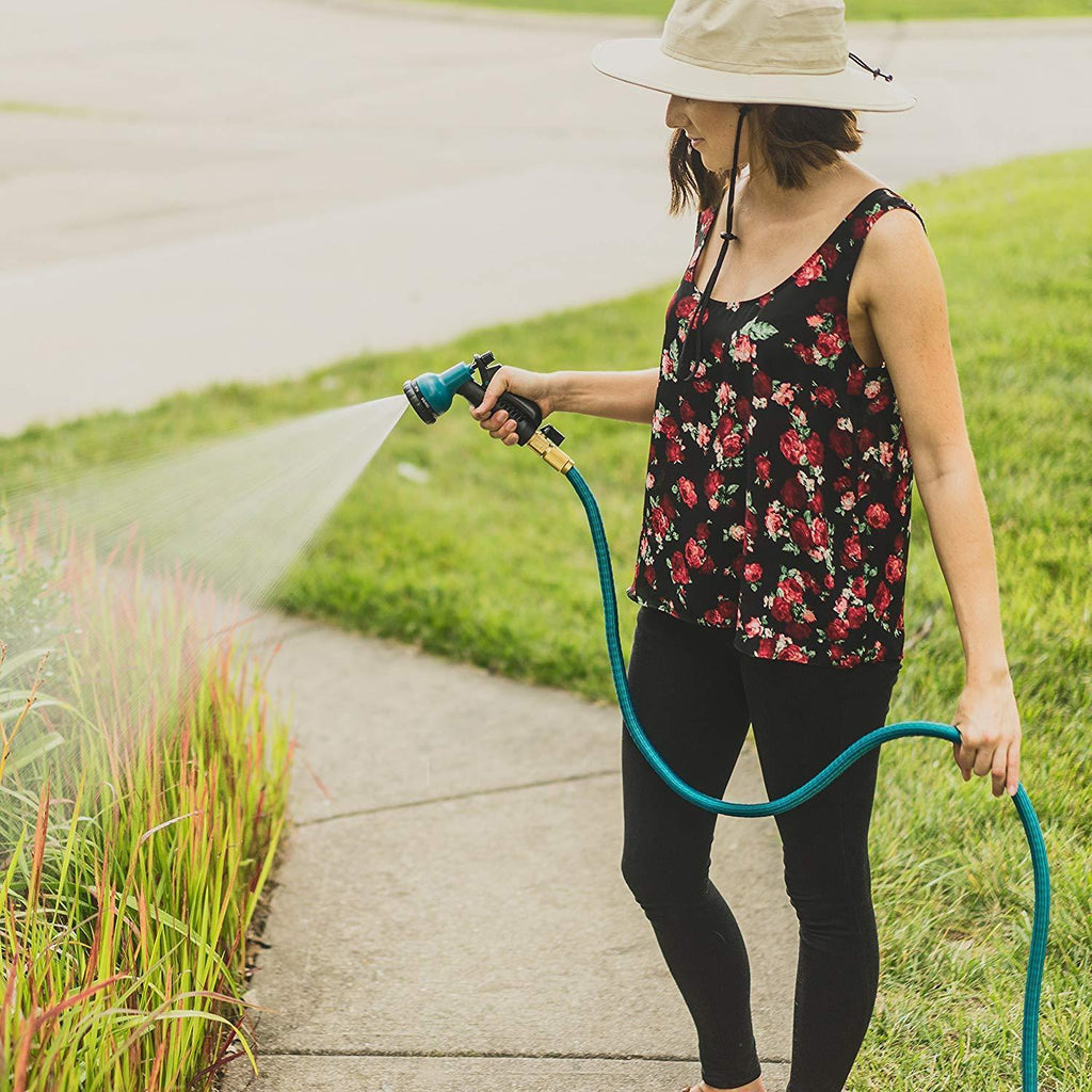 EXPANDING HOSE - Retractable garden hose expands from 17 to 50 feet for easy and convenient storage LIGHT AND COMPACT - Lightweight hose that effortlessly coils and neatly folds into a small storage bag when retracted NO KINKS OR TANGLES - Best no kink garden hose on the market; no frustrating dents or tangles like rigid rubber hoses STRONG AND LEAK PROOF - Heavy duty hose won’t leak or fall apart; designed to last with durable fabric casing and solid brass fittings POWERFUL SPRAY - High pressure water hose with an 8-pattern spray nozzle to easily adjust the watering pattern