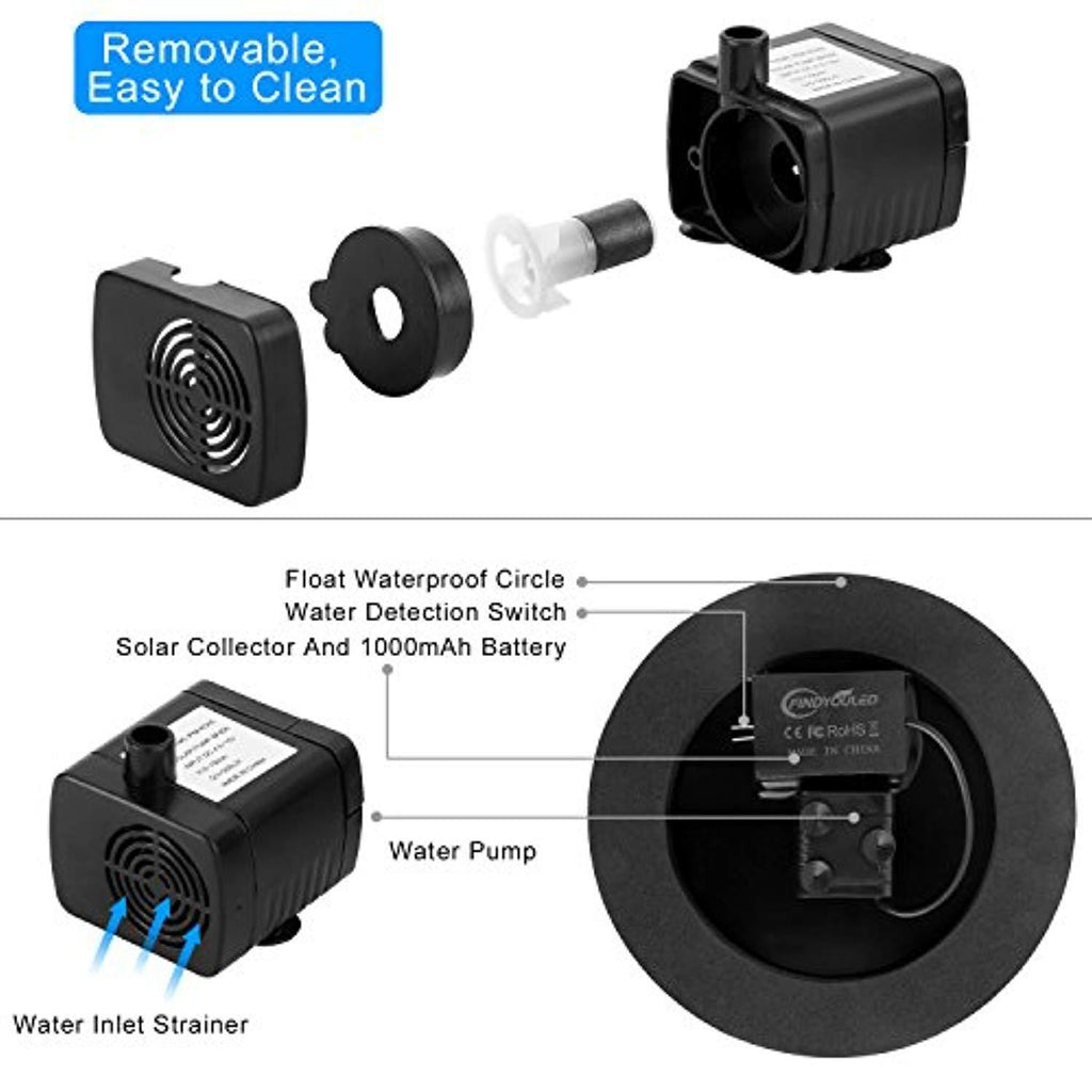 REMOVABLE, WASHABLE NOZZLE: Solar pump is added a new bottom cover to effectively prevent clogged nozzle. The solar powered bird fountain kit will stop working when dirty or blocked. With regular cleaning no worries, no stress.