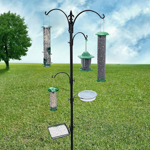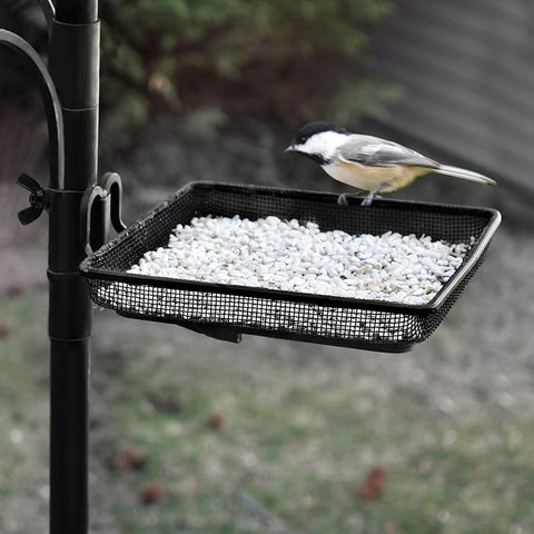 • EFFECTIVE: Twin top hooks are great for hopper, tube and nyjer feeders - effective in attracting smaller birds like finches, chickadees, titmice and junocs. A set of two additional arms offers more hanging options such as a suet basket for attracting nuthatches, woodpeckers, parrots, wrens and starlings. The mesh tray can hold mealworms, peanuts, dried fruit or milo which attract ground feeding birds like cardinals, juncos, doves, robins and jays. The plastic water bowl functions as a birdbath.