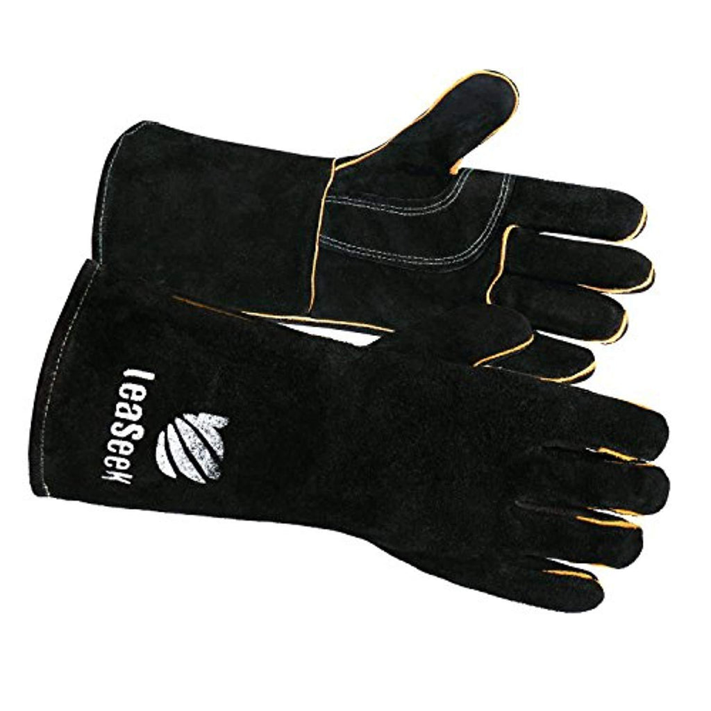 Leather Barbecue Gloves by LeaSeek - Heat Resistant & Flame Retardant Welding Gloves & Fireplace Gloves & Grill Gloves & BBQ Gloves, Heavy duty, Black - 14