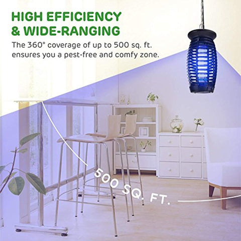 • EFFECTIVE FLY CONTROL - This bug zapper features a 15-watt high-intensity ultraviolet bulb that attracts all pesky flying insects into the fly zapper. The high-voltage grids will immediately electrocute mosquitoes upon contact by physical way. No chemicals, radiation or odor any more.