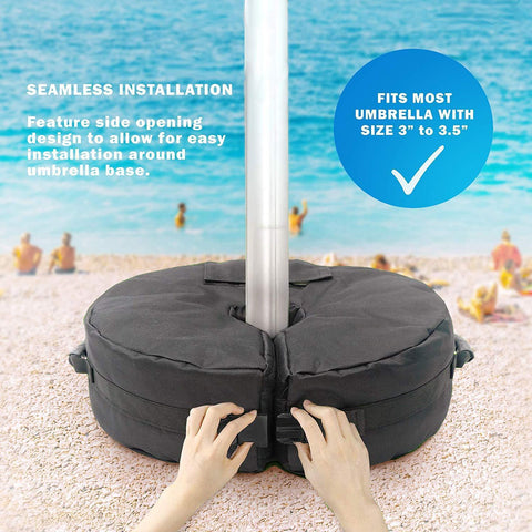 ✔️ DESIGN — Side opening for easy installation on any patio umbrella stand. Large velcro opening for simple, tidy sand filling. Reinforced sides for extra sturdiness. Strong convenient carry handles to reduce pain and pressure when removing base weight bag from umbrella.