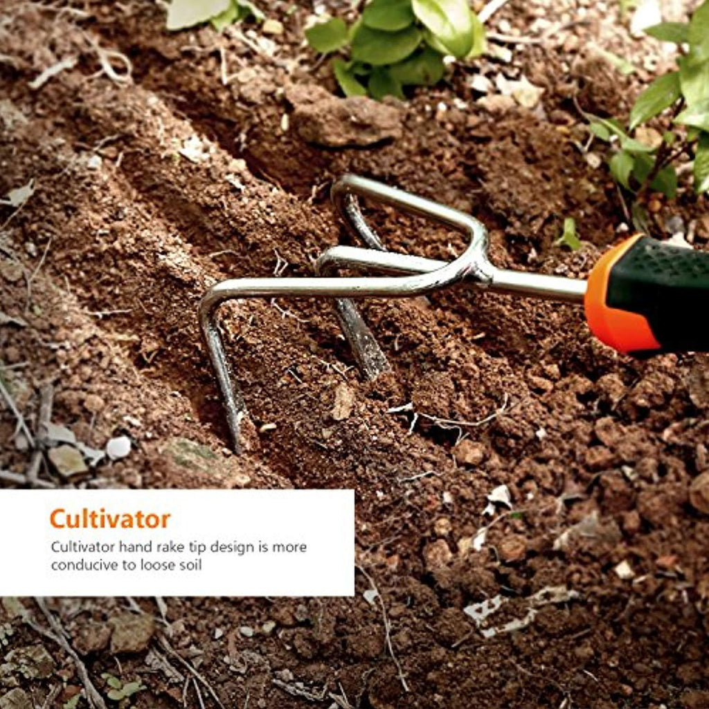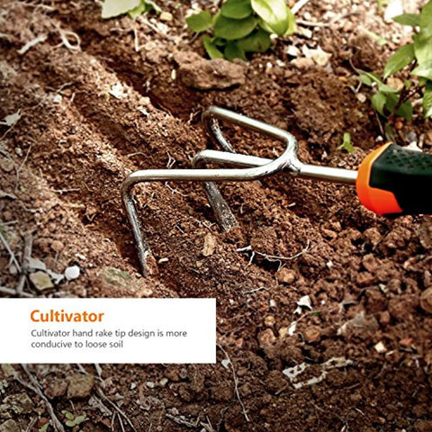 ▲UNIQUE DESIGN & LENGTH GRADING MARK: Cultivator Hand Rake tip design, more conducive to loose soil; Transplant Trowel has a length grading mark, which is easier to transplant small plants and flowers