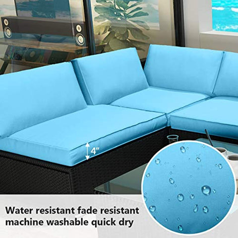 • [Patio Sofa Set Includes] 4 middle sofas, 2 corner sofas, 1 coffee table with removable 28.35’’ x 28.35’’ x 0.2’’ tempered glass top rests securely on the sturdy wicker table, allowing a sophisticated touch and more convenience to clean ; Also included are 10 seat clips for the underside of the sofa pieces to keep them from sliding apart.