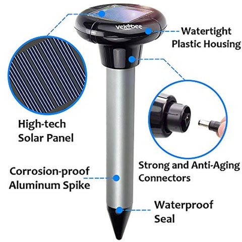 • Sonic Pulses Against Burrowing Rodents: Vekibee Solar Sonic Mole Repeller vibrates and emits 400 HZ low-frequency sonic pulses every 20 seconds to repel burrowing rodents. The vibrations and sonic pulses are harmless to human, pets and environment.