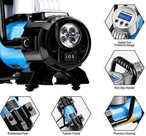 [ LCD BACKLIT DIGITAL DISPLAY ] - AUTOWN tire pump apart from inflating air, the built-in digital air gauge can also check and monitor tire pressure with large bright LCD backlit digital display. Four display units: PSI, KPA, BAR, KG/CM²; Measuring range: 0-120 PSI with precise accuracy of 0.5 PSI. The Bright 4 pcs LED Lights allow easy operation in the dark and ensure you are seen to avoid any danger.