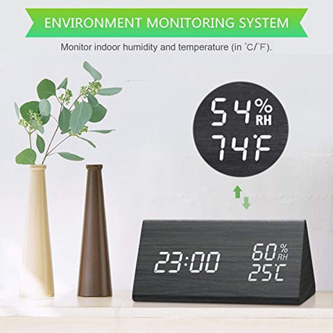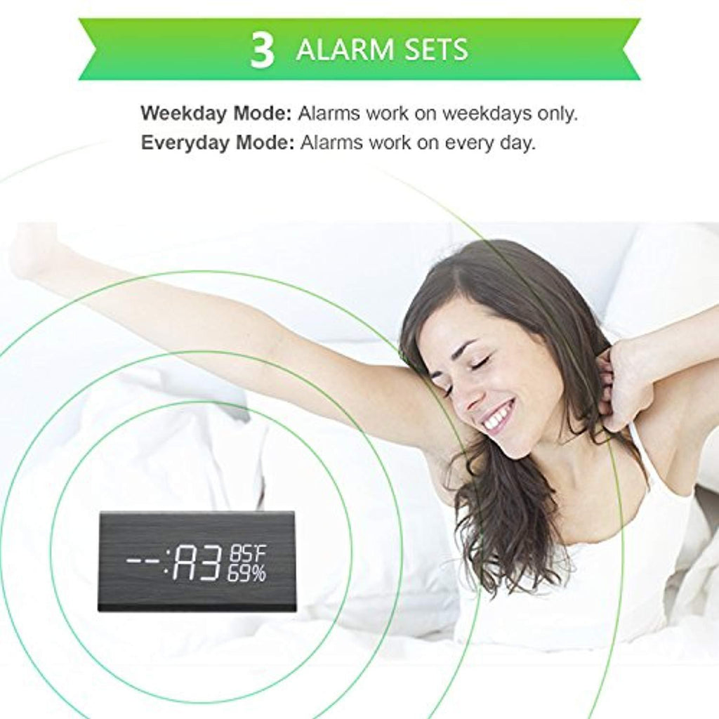Digital Alarm Clock, Dual Time (12/24) Mode, Three Alarm Sets, Date LED Display, 3 Levels Brightness, Temperature and Humidity Wood Grain Clock for Bedrooms