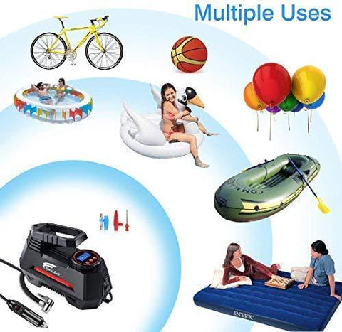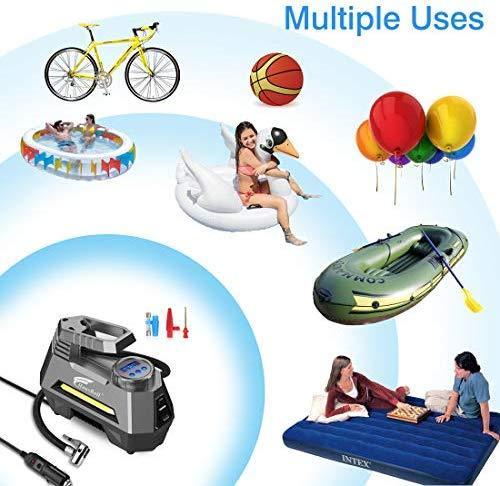 【 Multiple Uses 】 The portable air compressor pump comes with a 9.8ft (3 meters) long power cord and inflatable adaptors (3 additional nozzles), convenient connecting to front and rear wheels. Perfect air compressor pump for cars, some small trucks, motorcycles, bicycles, Jeeps, SUVs, inflatable boats, sports balls, air mattress and other inflatables.
