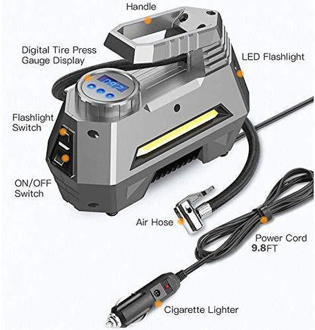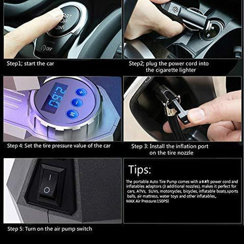 【Max 150PSI Working Pressure】The 12V DC portable air compressor with digital gauge display has MAX 150PSI working pressure. Plug directly into Cigarette Lighter Socket of your vehicle. Tire pump works fast and accurate. It will auto shut off when reaches the desired set tire pressure. Overheat protection shuts off automatically when overload. 120W high power engine delivers super fast inflation rate 35L/min.