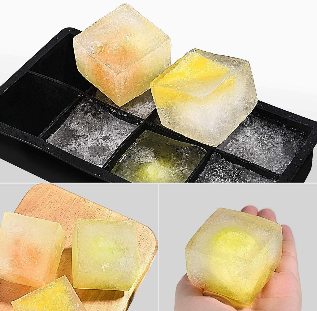 【Large Size】:8.5 x 4.5 x 2 inch.This set includes 2 premium silicone ice trays with 8 large ice cubes per tray. Each cube measures 2 inch square, perfect for whiskey, tequila or other mixed drinks. Our big ice cubes melt slower and cool your alcohol drinks fast without watering them down.