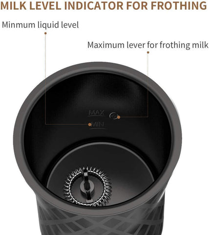 ☕[AUTOMATIC TURN-OFF]: This electric milk steamer has been designed with an automatic switch-off system. With the Strix temperature controller, it automatically shuts off when milk or foam is made or when the temperature reaches 65±5 ℃, thus to avoid overheating. Maximum capacity of 115ml. of dense foam / 240ml Hot milk to make 2 perfect cups of Cappuccino or Macchiato in 2 minutes with one-button start-up feature.