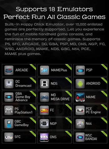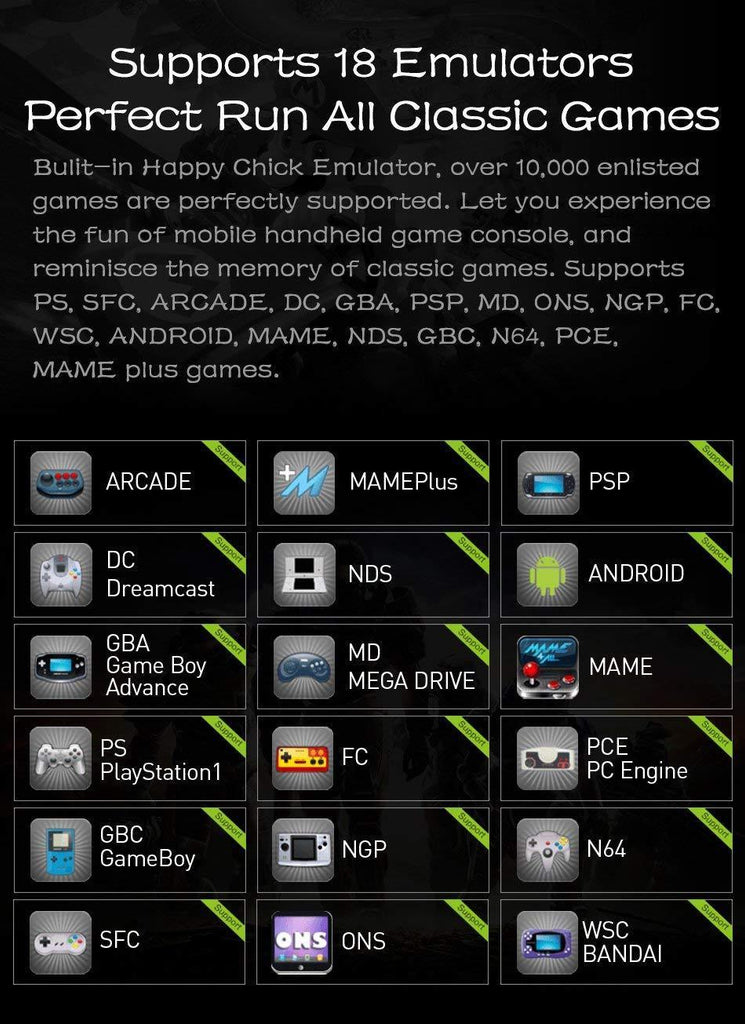 Full-featured button, dual 3D joystick(Joystick can be pressed), giving you the best game control experience .Supports Andriod/PC Games,Support PSP/PS/NDS/DC/N64/ARCADE/MAME/CPS/GBA/GB/FC/SFC/SEGA et cetera 18 simulators Games.