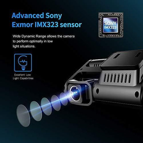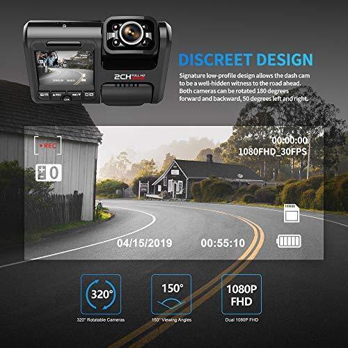 [DISCREET DESIGN] Signature low-profile design allows the dash cam to be a well-hidden witness to the road ahead. Both cameras can be rotated 180 degrees forward and backward, 50 degrees left and right.