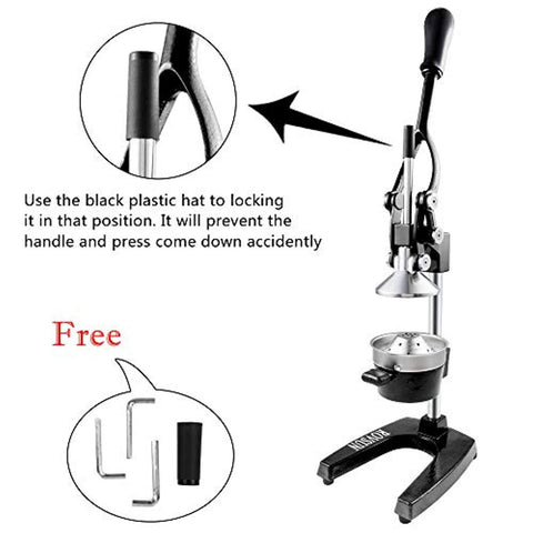 FREE SAFETY HAT: Only ROVSUN can send you the safety hat. Use the black plastic hat to lock it in that position. It will prevent the handle come down accidently. This heavy duty juice crusher have long and light handle with comfortable rubber grip which stop and reduce pressure on the hand.