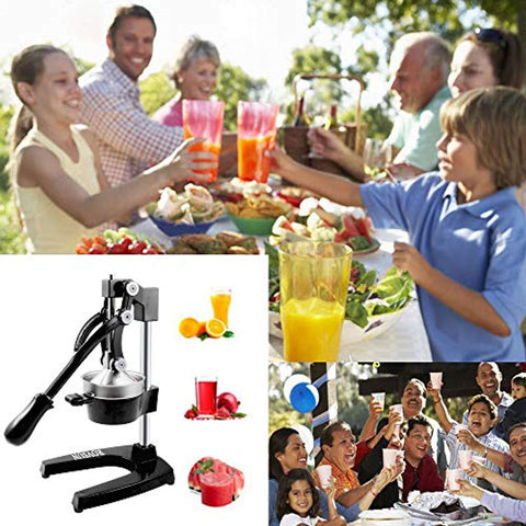 PURE DELICIOUS JUICE & HEALTH LIFE: Different with an electric juicer machine, our hand press commercial citrus juicer will not rub the rind, so you can enjoy the good taste juice without bitter rind taste. This large commercial juice press extracts every last drop out of oranges, grapefruits, lemons, limes, pomegranates with handy and professional juice press.
