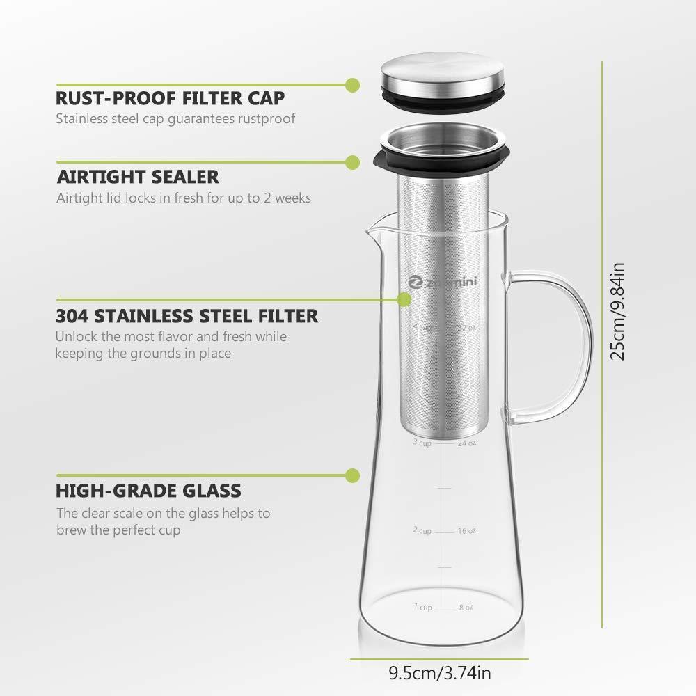 Higher Quality and Durability: Made from high-grade stainless steel ( 304 ) removable precision cut filter&lid and borosilicate glass, zanmini cold brew coffee maker is very strong, the airtight sealer won't leach nasty chemicals into your coffee. temperature range is - 20 Deg.C to 200 Deg.C. Dishwasher-safe&Easy-clean.