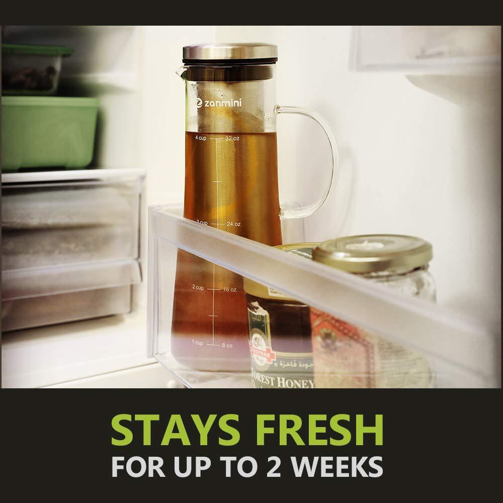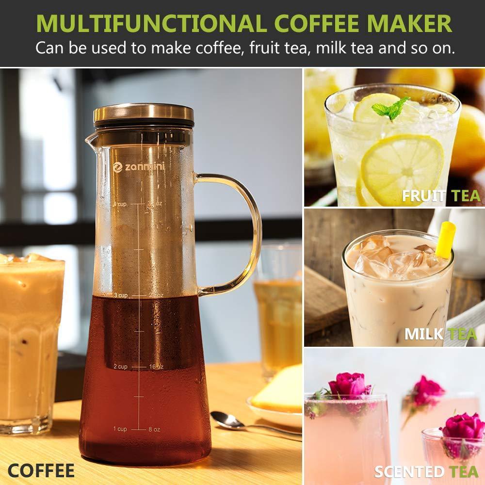 zanmini Cold Brew Coffee Maker, 6 in 1 Glass Infusion Pitcher(1 Quart/32 oz) with 304 Stainless Steel Filter and High-Grade Glass Pitcher for Hot/Cold Coffee, Tea, Fruit, Juice, Milk and Beer
