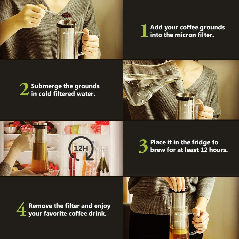 Got Delicious Cold Brew Coffee in 3 Steps: Add the coffee ground into the filter, then submerge the ground in cold fliter water, finally put it in the fridge, 12 hours later you will get a fresh 32 ounces cold brew coffee. Don't have to go to the coffee shop to buyer any more.